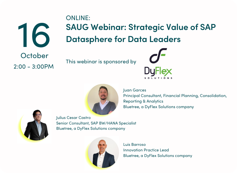 Bluetree and DyFlex will share insights in this webinar from customer journeys, including lessons learned, challenges to overcome and the strategies that deliver real impact. You will hear how organisations are aligning Datasphere with business goals, building confidence in their data and creating stronger connections across the business. The discussion will also show how Datasphere serves as the data integration and modelling layer within SAP Business Data Cloud (BDC) together with Analytics Cloud, SAP BW and Databricks to drive enterprise wide transformation.
